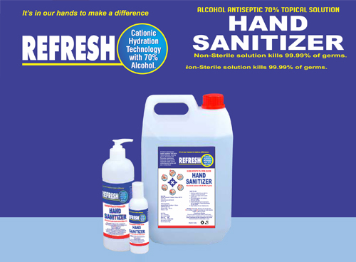 Refresh is a high performance hydro-alcoholic hand sanitiser Solution. Formulated with cationic surfactant system that disinfects thoroughly yet is gentle on hands. Refresh contains the active Agent Cetrimide that dissociates to a large complex cation when applied on hands destroying Virus, Fungi and both gram positive and gram negative bacteria. Cetrimide is the safest antimicrobial agent as it is poorly absorbed by the hands on application.